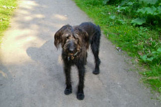 Sam ist als Fundtier im Alter von 3,5 Monaten ins Tierheim Solingen gekommen. Da zu der Zeit im Tierheim schon mehrere Hunde an einer ansteckenden Krankheit gestorben waren, habe ich Sam als Pflegehund mit nach Hause genommen. Leider merkte ich schnell, dass er kein süßer, niedlicher Welpe war. Er war ganz schön schwierig. Einerseits eine Mimose, andererseits auch sehr dickköpfig. Außerdem stellte sich heraus, dass er aus einer sehr schlechten Aufzucht kam. Viel kennen gelernt hatte er nicht und Männer fand er sehr bedrohlich. Die Vermittlung gestaltet sich recht schwierig, denn die erfahrenen Leute wollten keinen solchen Hund und den unerfahrenen konnte man ihn nicht geben. Also blieb er bei mir. Auch wenn er manchmal ganz schön anstrengend ist, möchte ich ihn nicht missen. Im Training in der Hundeschule ist er ein zuverlässiger Hund und wenn er ( wie z. B. beim Agility ) Publikum hat, ein großer Clown. Er liebt es Menschen zum Lachen zu bringen.24.08.2005